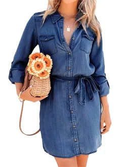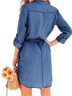 Women Casual Dress, Solid Color Long Sleeve Button-Down Lapel Short Dress with Belt